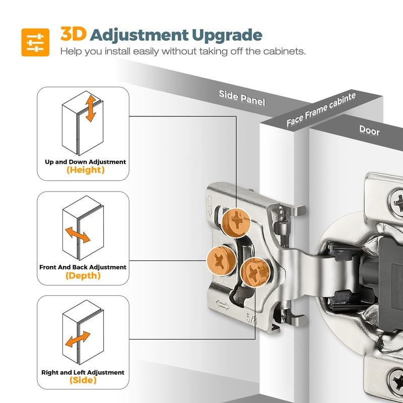 - Three-Way Adjustable: Easy to install and adjust with a screwdriver, ensuring cabinet doors do not sag, maintaining proper alignment and smooth operation.