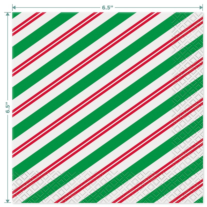 - Featuring adorable gingerbread house plates with scalloped edges and peppermint stripe napkins in a classic red and green color palette.