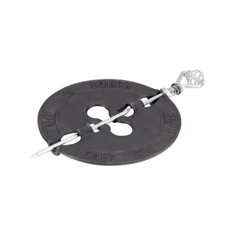 Point pierces any ordinary stove pipe. Steel spindle is 1-piece continuous construction. This unique spike and handle system is made of sturdy steel. Disc is made of cast-iron. Full-tension grip is not affected by heat. Spindle has a hump guide that guides the spindle into locking position.