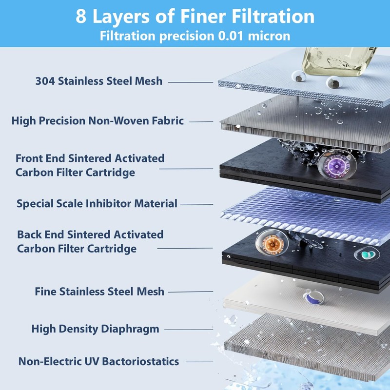 - 99% Advanced Filtration:New 2.0 Filter Element of the faucet filter uses non woven fabric layer to effectively reduces 99.9% chlorine, asbestos, particulates, benzene, taste, odor and etc. While the advanced FOF material filters out fine suspended particles.