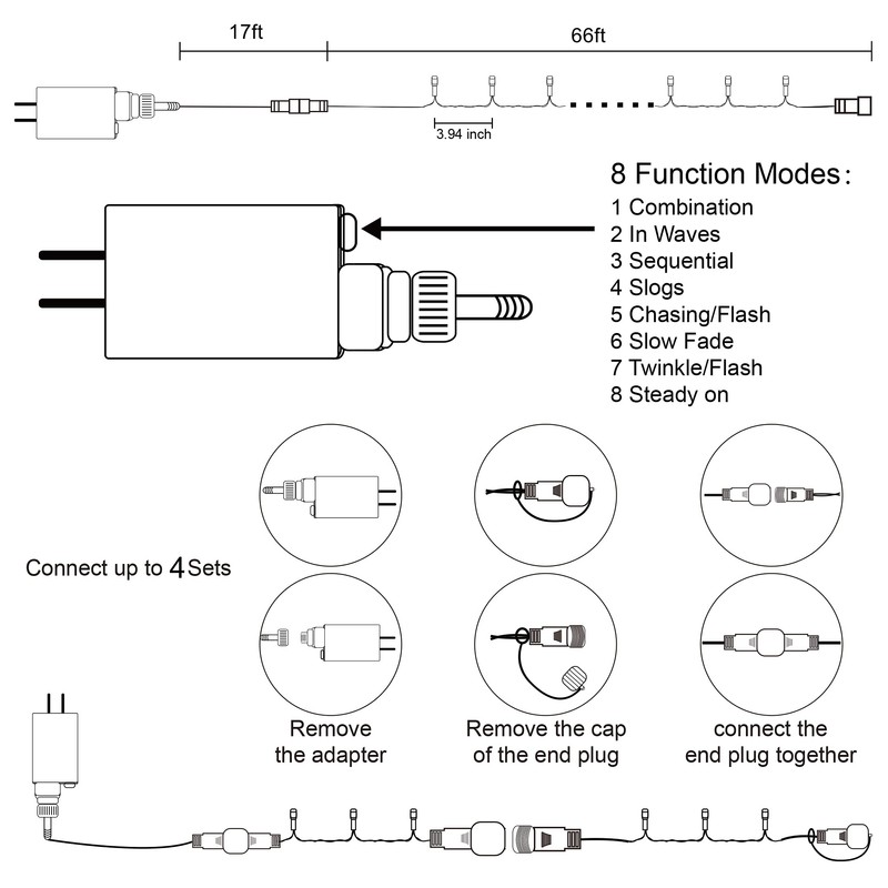 Adapter to the first LED light: 17ft. Total length(lights string and leading line): 83ft.
