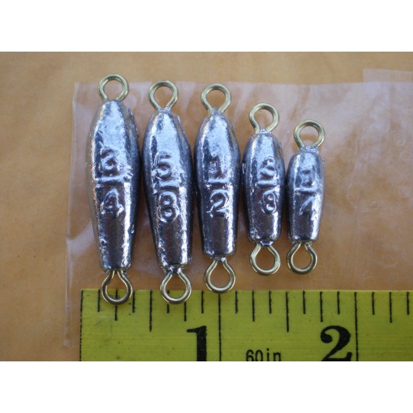 HOME MADE 75 PCS. IN LINE TROLLING SINKER 5/8, 1/2, 3/8, OZ. 25 EA. W/BRASS W...