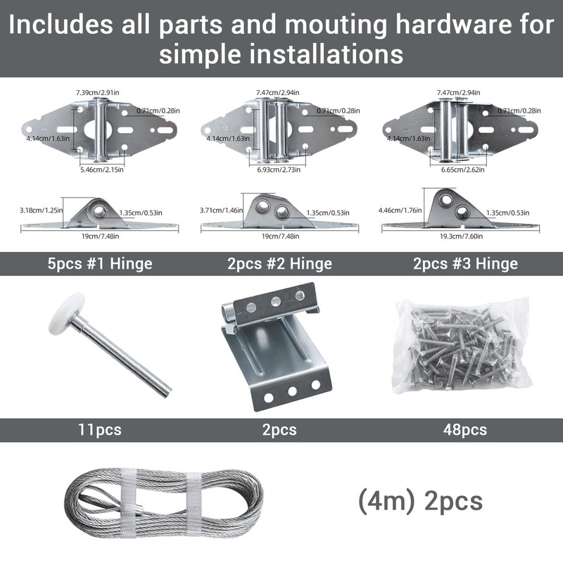 - Package include 5 Pcs #1 14 gauge hinges ,2 Pcs #2 14 gauge hinges ,2 Pcs #3 14 gauge hinges ,2 Pcs adjustable top roller brackets ,11 Pcs ball bearing nylon roller wheels suitable for 2"garage door track,1 Pcs safety wire rope and mounting screw hardware.