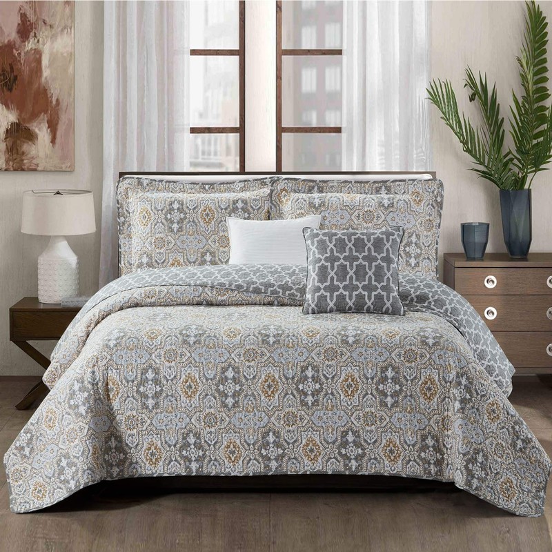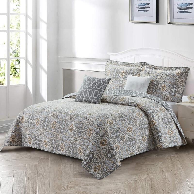 Home Soft Things Lanza Printed Microfiber Quilt Queen 90" x 90" 5 Piece Bedding Set with Matching Shams Pillows, Mustard Gray Blue Floral Design Reversible Bedspread Coverlet