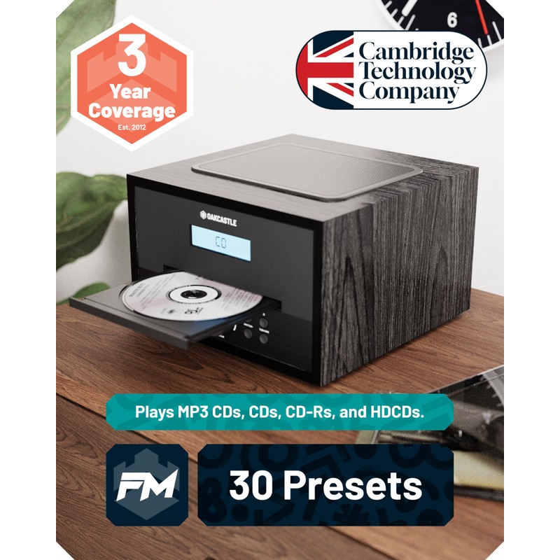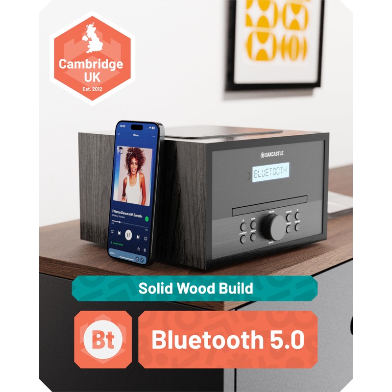Home Stereo System with CD Player Bluetooth & Radio | 40W FM Radio, Solid Wood Build, 30 Presets, and Dual Alarm | Multi Format Support, CD Player for Home, Compact Music System | Oakcastle Hifi400