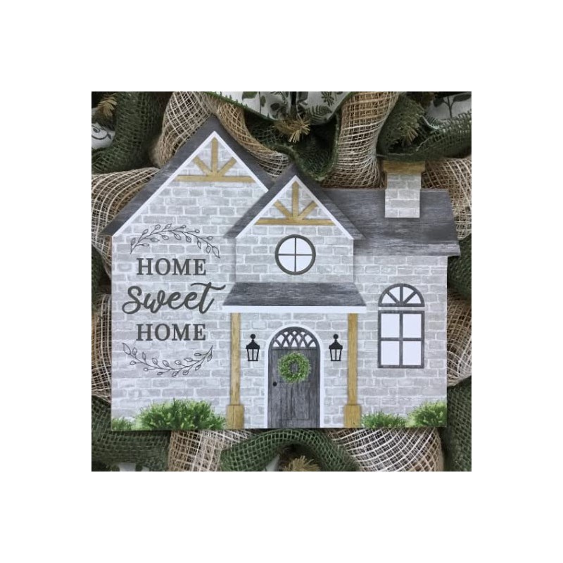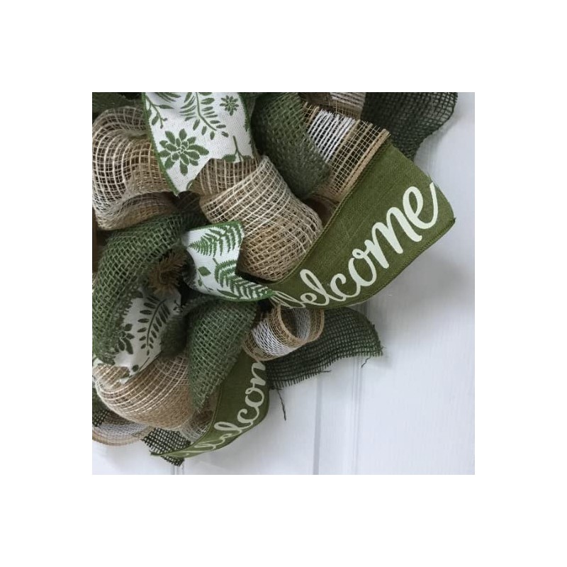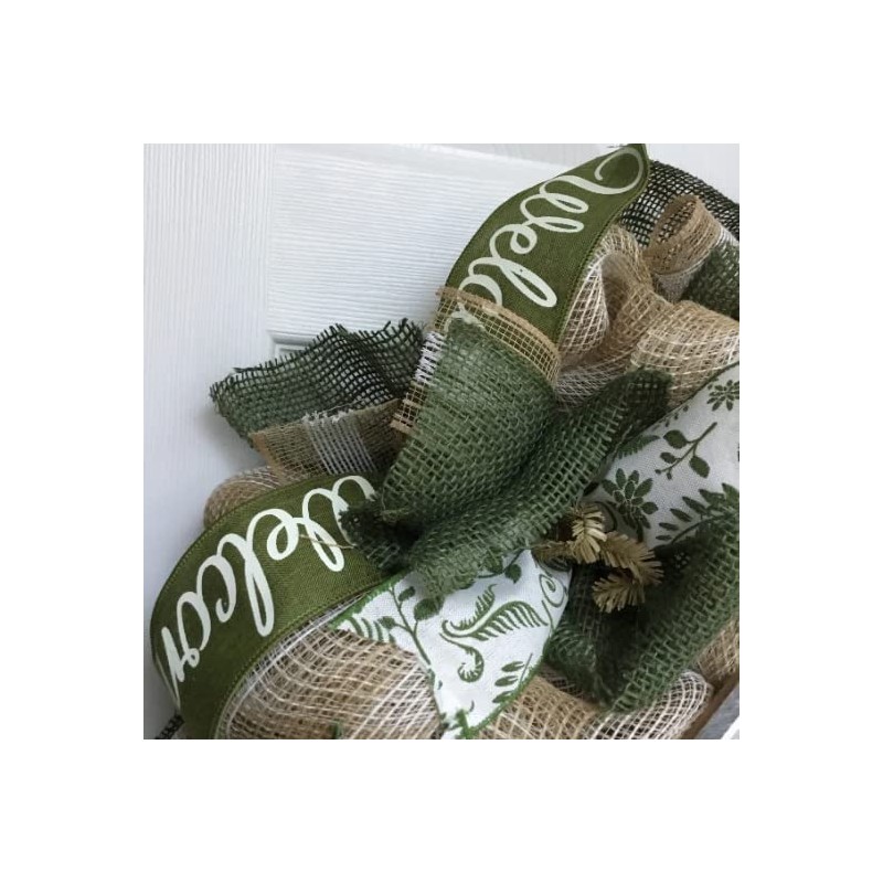 Beautiful, full, handmade deco mesh all occasion welcome wreath. A large, wood, house shaped, welcome sign rests on a bed of white and natural plaid fabric deco mesh. The accent is decorated as a cozy home and has the wording “Home Sweet Home.” Beautiful ribbons decorated with greenery and green canvas ribbons surround the center. Soft green canvas ribbons and natural/cream mesh ribbons are placed along the outer ring. Four large Welcome ribbons are placed along the exterior. The size is available in 24 inch or 28 inch diameters and 6 inches deep