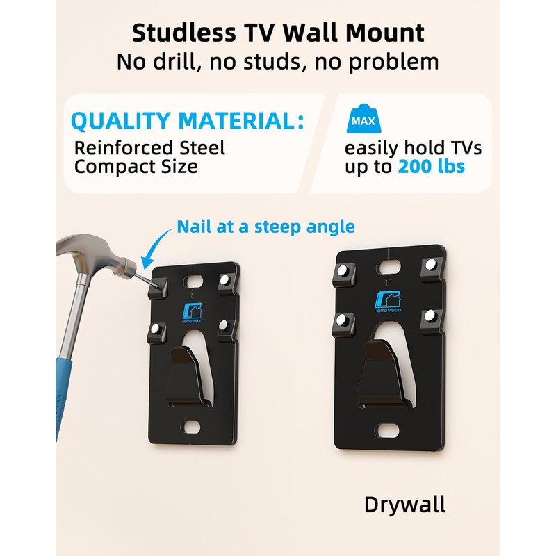 - No Stud, No Drilling TV Mount: This studless TV mount does not require any drilling or installation experience. Only use a hammer to secure the wall panel with nails on the drywall. No stud TV mount comes with movable EVA Pads, if you need your TV to be parallel to the wall, just stick it on