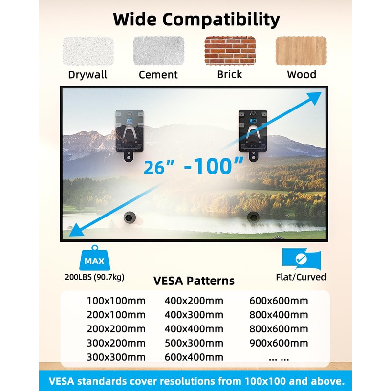 HOME VISION No Stud/Studless TV Wall Mount Bracket for 26-100 Inch Flat/Curved Screens, Universal VESA, 200Lbs Capacity, Fits Drywall, Wood, Concrete, Brick, 1.18" Slim, Renter-Friendly, HV1402