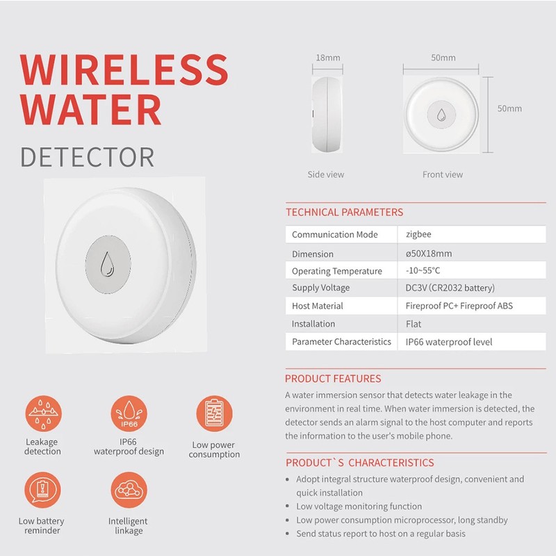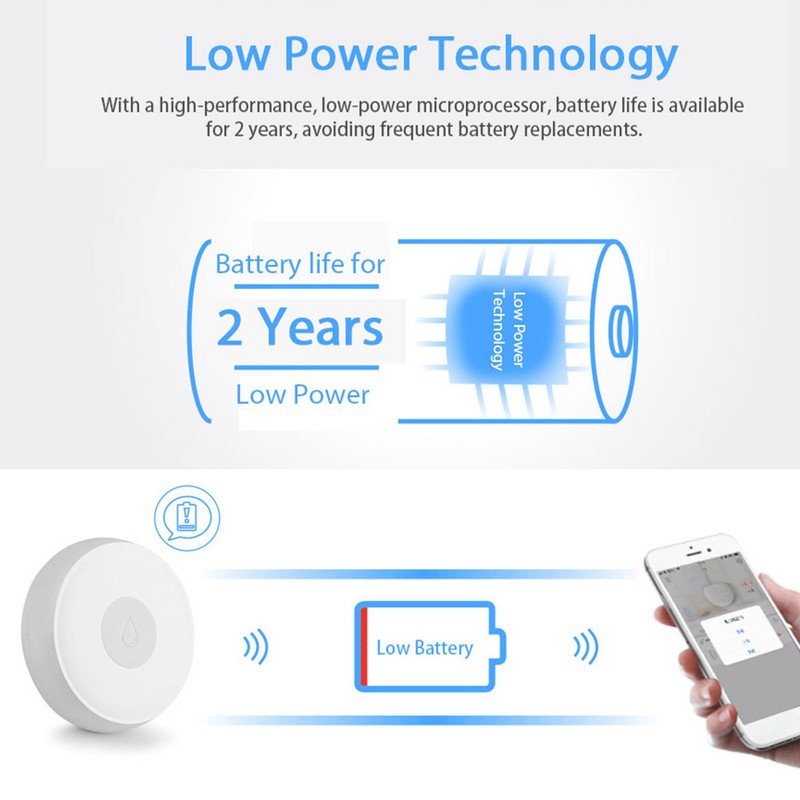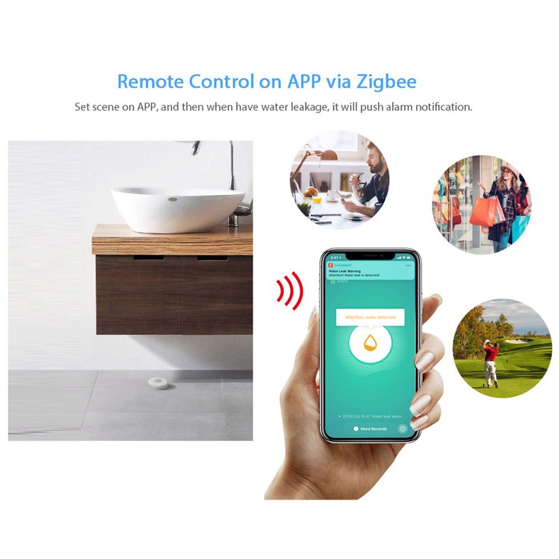 1、After the APP remote control is connected to the ZigBee Hub, download the APP "Smart Life / Tuya" on for iOS and for Android to detect water level overflow. 2、When water leaks from the bottom of the sensor, it will send an alarm signal to the Zigbee gateway and push the alarm notification to your phone. 3、Voice control and history tracking are compatible with IFTTT. Just use voice to control connected devices. 4、Suitable for apartments, warehouses, offices, laboratories, hotels, garages, etc. 5、The low power consumption miniature size can make it work for a long time. 6、An alarm is generated when the battery is low. 7、Easy installation does not require complicated installation tools. It only takes a few steps to install the sensor using double-sided tape.