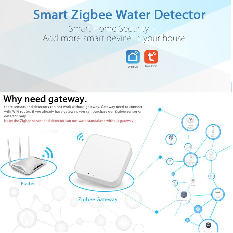 The smart ZigBee water leak sensor must be used in conjunction with the Tuya gateway hub that supports the ZigBee protocol. Cannot work without Tuya ZigBee Smart Gateway