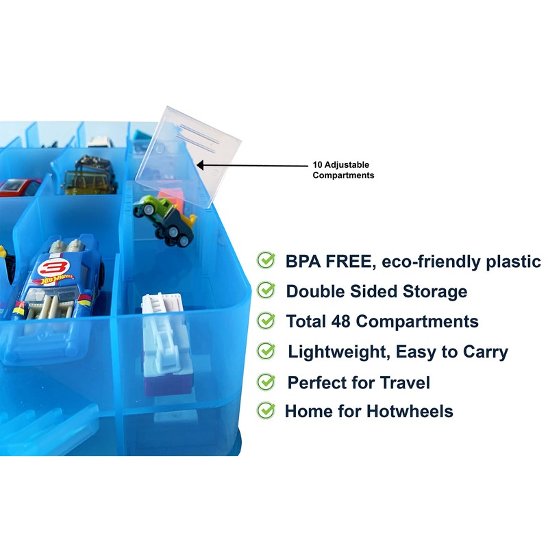 HOME4 Double Sided BPA Free Toy Storage Container - Compatible with Mini Toys, Small Dolls Hot Wheels Tools Crafts - Toy Organizer Carrying Case - 48 Compartments (Blue)