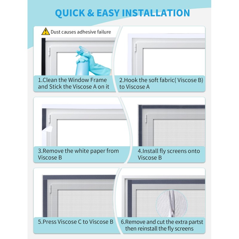 Window Screen with Hook and Loop Adhesive Edging Frame is Easy-install, convenient for peel and stick, and resist deformation despite frequent use.