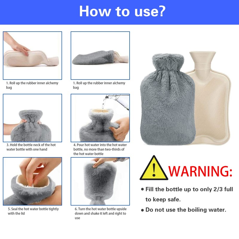 - Safe and durable - The hot water bottles have been made from premium natural rubber, CE compliant, BS1970:2012 safety tested and monitored, tested for harmful substances. A soft, warm gift for kids, adults and parents in the cold winter day and night.