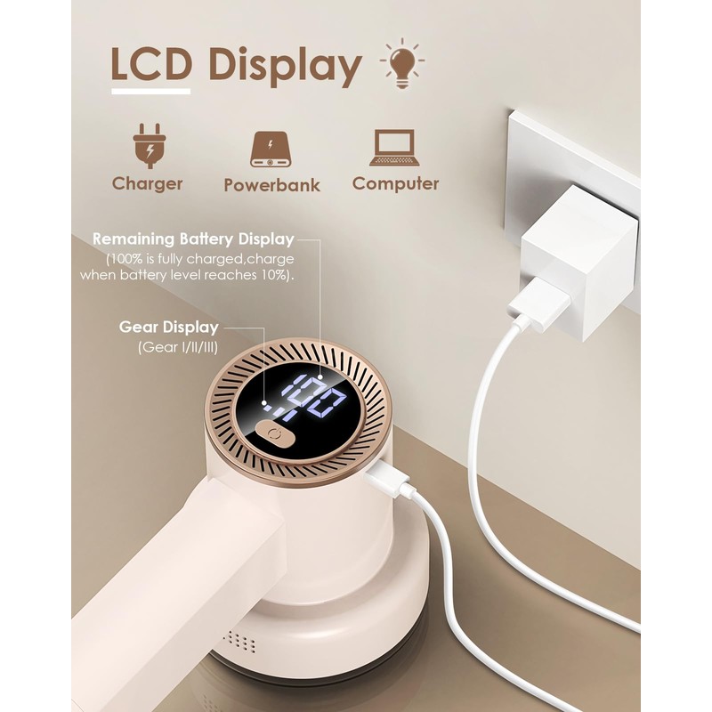 - 1. LED Digital Display - The fabric shaver fuzz remover can clearly show the remaining battery and speed gear on the LED screen. The battery level ranges from 0 to 100, you can directly see the battery remaining whether it is charging or in use, which is very convenient. Note: When the display battery level is less than 10, it needs to be charged