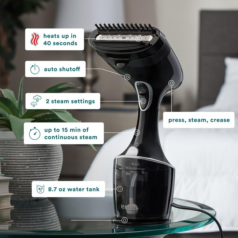 Homedics PerfectSteam Handheld Garment Steamer for Clothes, Sheets and Curtains - 1550 Watts Portable Garment Steamer, Fast Heat, Turbo Power, 15-Minute Continuous Steam, Built-In Crease Attachment