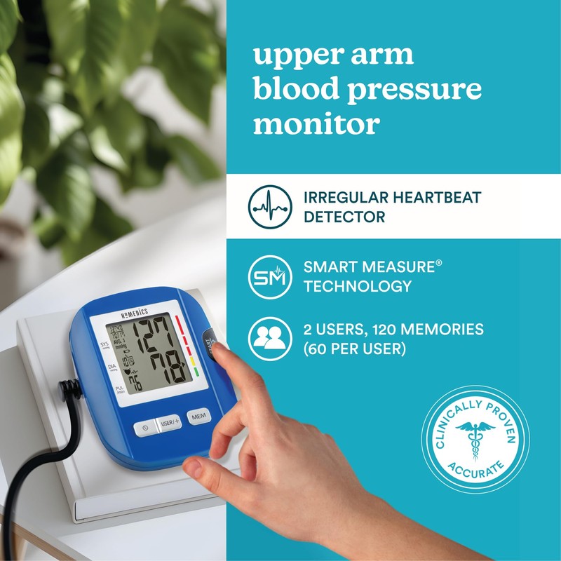 This home blood pressure monitor features advanced technology to automatically inflate and deflate at the appropriate level, delivering a personalized accurate and comfortable measurement. Plus, it’s designed to hold memory for two users with the ability to store up to 120 readings (60 for each user). Each user can view their last 3 blood pressure readings for close monitoring too.