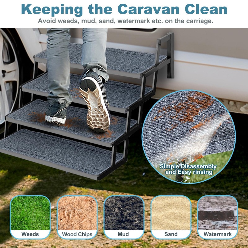 - The rough texture of the RV stair cover adds an extra layer of cushioning to the stairs, not only protecting them from UV rays, snow, and rain, but also preventing slips and falls. The RV stair mat is also easy to clean,simply rinse with water to remove most dirt, keeping your RV looking fresh and inviting at all times.