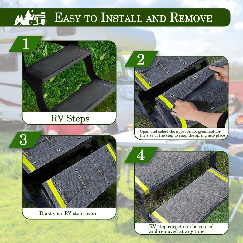 - 4 Pack RV Step Carpet - The ideal accessory to enhance the safety and comfort of your RV or camper. Designed specifically for RV steps with a reflective strip design for visibility in the dark, these durable step covers add style to your vehicle while providing superior protection against slips and falls, while reducing soiling and keeping your RV's interior clean.