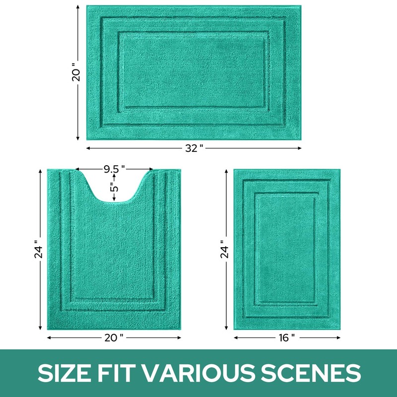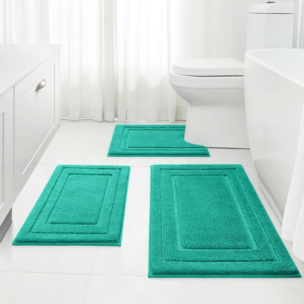 HOMEIDEAS Bathroom Rugs Sets 3 Piece, Super Soft and Absorbent Non Slip Microfiber Toilet Bath Mat with U-Shaped (Teal)