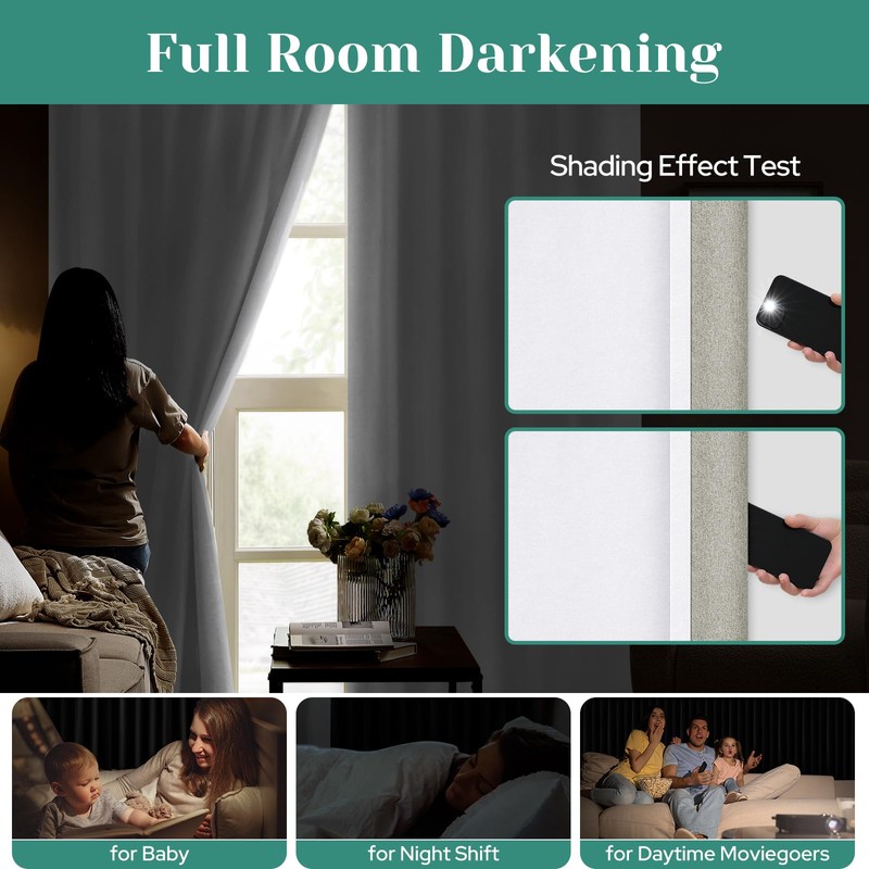 - 👍100% BLACKOUT: Made of premium thick durable chenille fabric that can block out sunlight, and UV rays effectively and provide thermal insulation, some degree of noise reduction, and total privacy protection, it is a perfect choice for babies and night shifters.