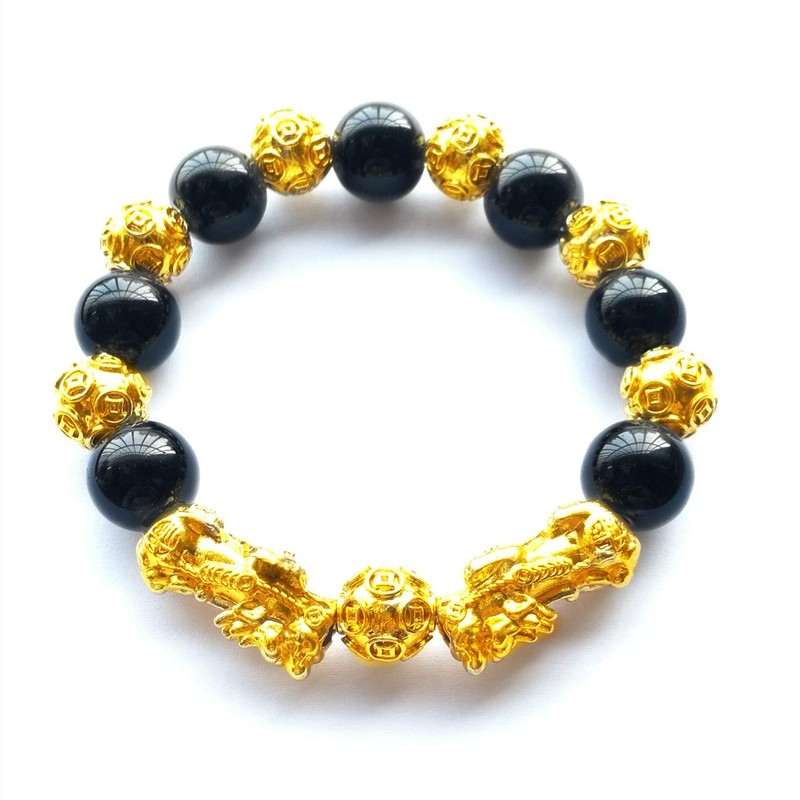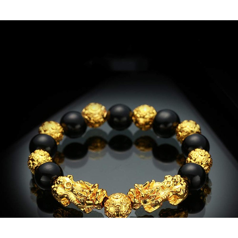 Homelavie Feng Shui 12mm Black Obsidian/Mantra Bead Bracelet with Double Golden Pi Xiu/Pi Yao and Copper Coins Bead Lucky Wealthy Amulet Brecelet, Metal