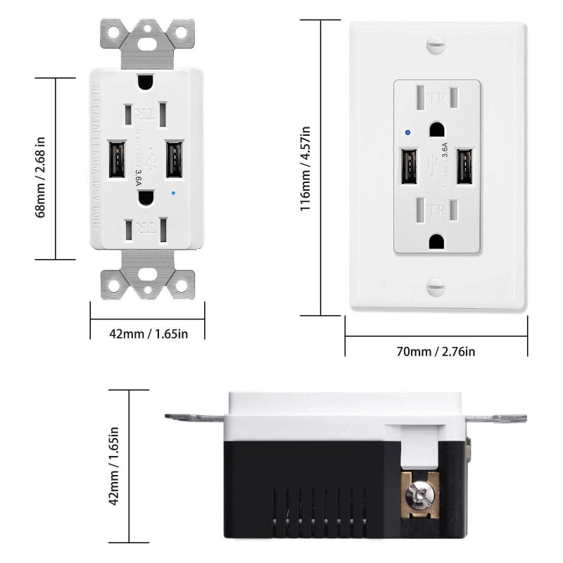 | Package includes: 1 x Dual USB Ports Wall Outlet Receptacle (Wall Plate and Screws are included) |
