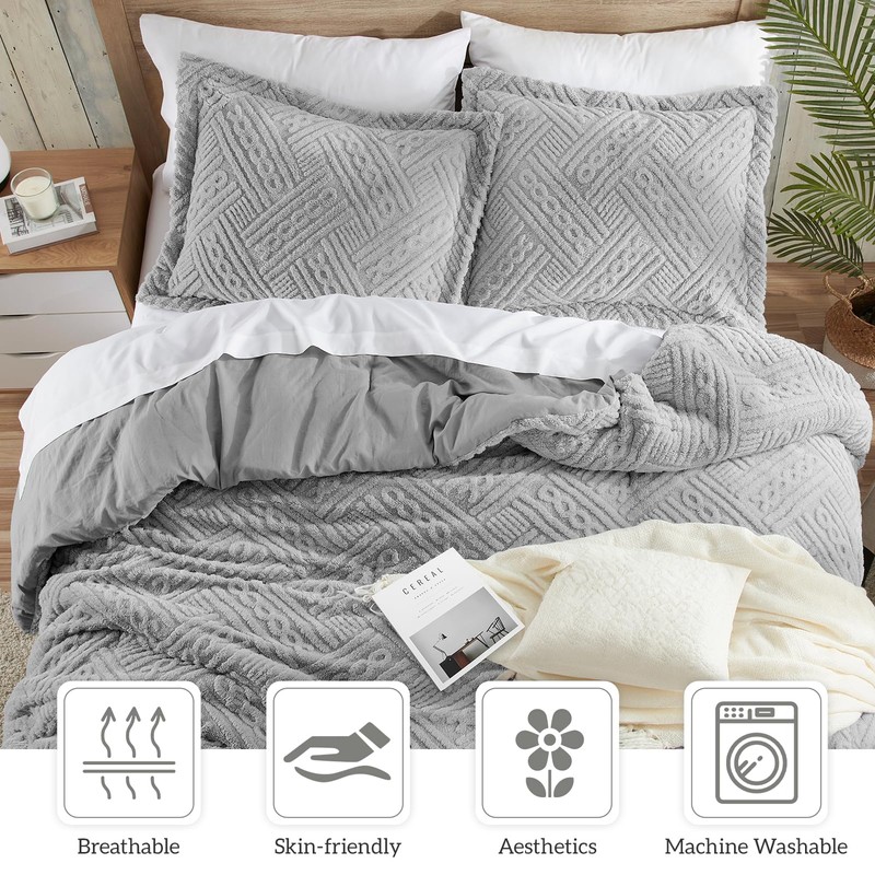 - 【Elegant Design】3 pieces plush king bedding sets include 1 comforter (106"x90") and 2 pillow shams (20"x36").The soft shaggy sherpa comforter sets features a tufted 3D cable pattern and a double-sided design with minimalist hidden neat stitching, adding an aesthetic touch to your home decor. This king bedding sets for men women adult ensures a cozy warm embrace, making it an ideal addition to your living space.