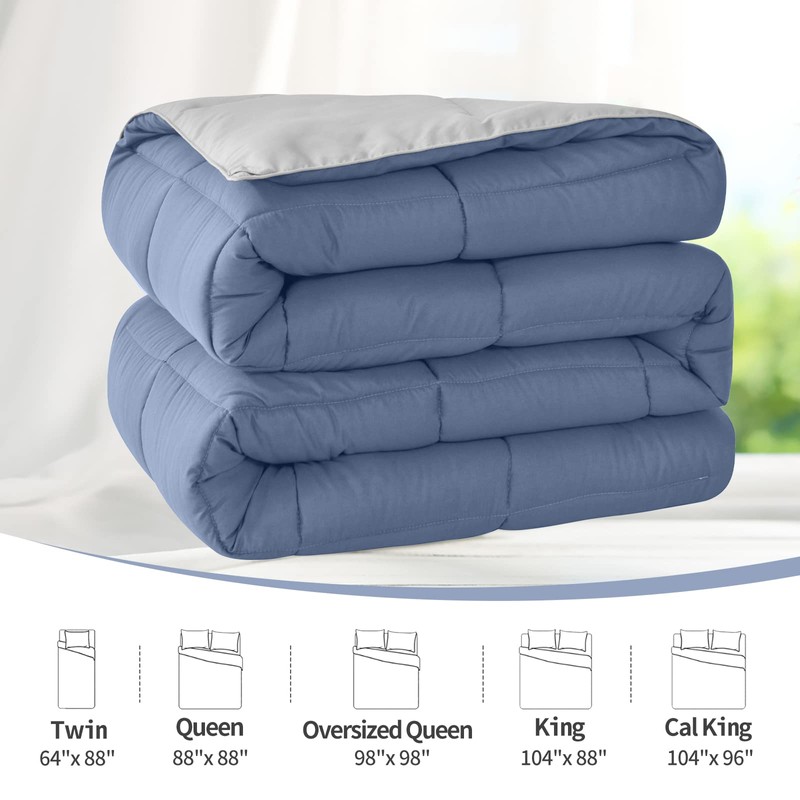 - EASY CARE & GREAT VALUE. The blue comforter full queen can be machine washable and dryable, very easy to care and save money. The grey duvet insert queen full with good workmanship, definitely worth every penny you spent. There are 5 sizes available, tiwn comforter 64x88 inch, full queen comforter 88x88 inch, oversized queen 98x98 inch, king comforter 104x88 inch, california king comforter 104x96 inch
