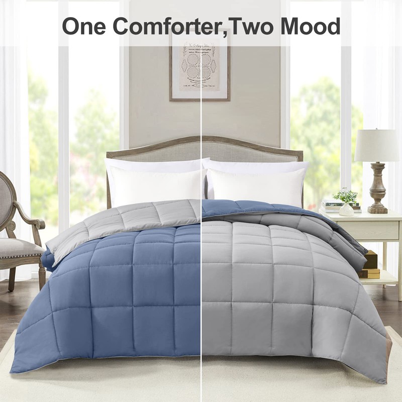 - ONE COMFORTER, TWO MOOD. The reversible comforter queen full size can be reversed depending on your bed sheets and your mood, one side is blue and another side is grey. There are more colors available, gray, navy, blue, brown, beige, white, black, red, purple, lavender, green, teal and ivory. The summer comforter full queen with 4 corner tabs to anchor duvet cover, so the bed comforter full queen size can be used as down alternative duvet insert or as a stand alone blanket comforter