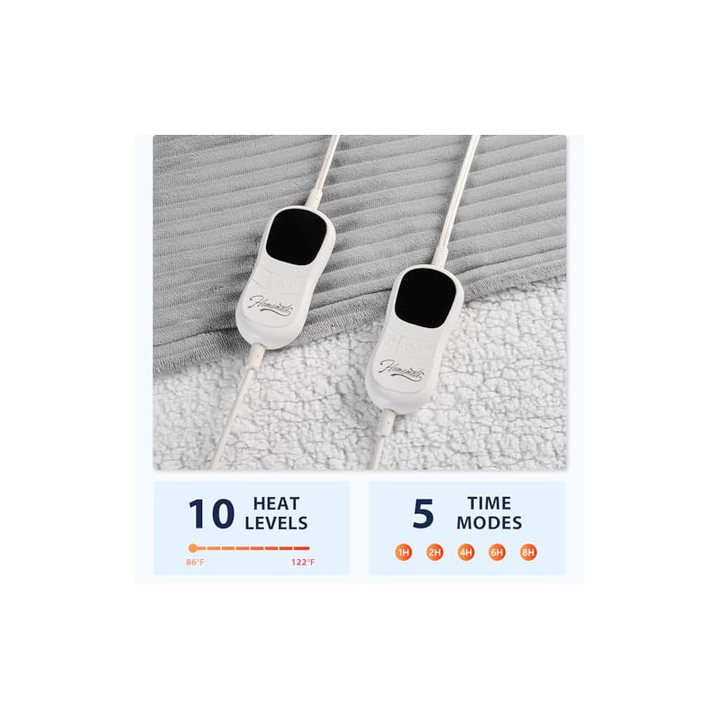 - EASY TO USE: Homemate heated blanket queen size have 10 heat levels,1/2/4/6/8 hours auto shut off. Temperature range is 86-122F.Very convenient to use,even the elderly,the sick,and the disabled can use it easily.Power Cord is 16.7 feet,this long cord makes the use of the blanket more flexible,can be used on the bed,on the sofa,can be used in the study and office, very convenient.