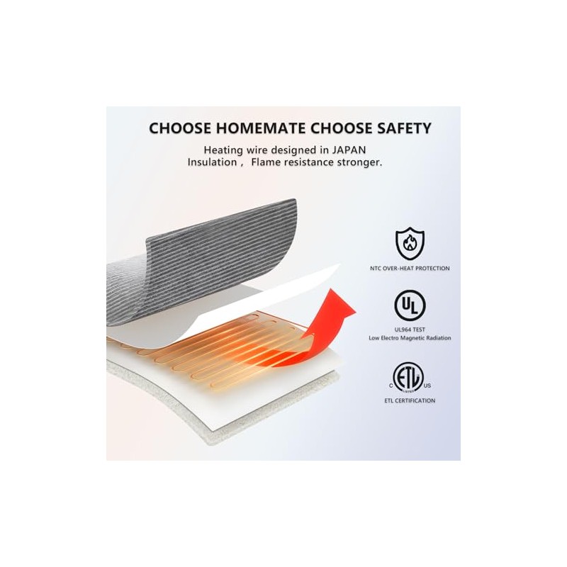 - Safety Features: Homemate Heated blankets have passed the American safety UL964 Test.Have ETL Certification.Lower Electro Magnetic Radiation. Moreover,the heated blanket use NTC overheating protection technology to ensure that it will not overheat and cause burning. Great for the elderly, senior citizens, pregnant women, pets, very safe and portable.