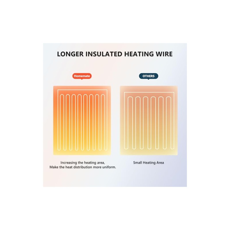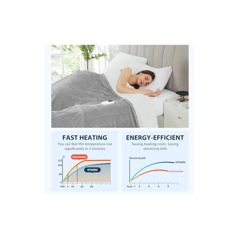 - Energy Efficiency: Homemate heated blanket use the intelligent temperature adjustment technology. The heated blanket will automatically adjust the temperature according to the surrounding environment,which can always provide warmth and comfort to the user. Compared to air conditioning, using a Homemate heating blanket is more energy efficient and environmentally friendly, saving you more money on heating costs during the long winter months and you won't waste a lot of electricity throughout the night.