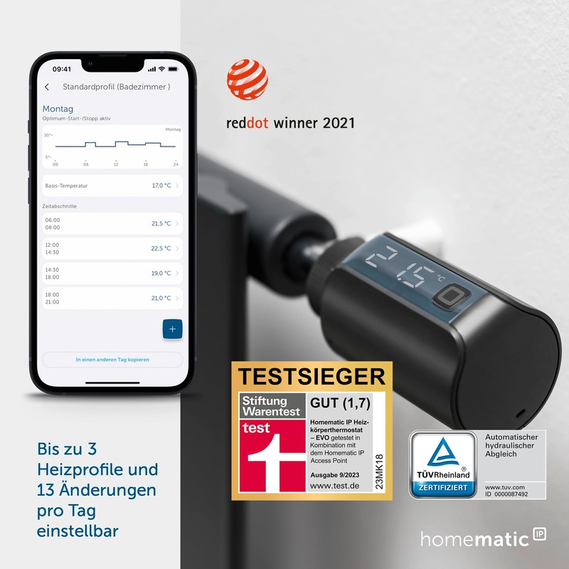 • With the Evo radiator thermostat you can save up to 33% on heating costs – thanks to individual temperature gradients with up to 13 changes per day in three adjustable heating profiles and in combination with window-on-detection with a window and door contact