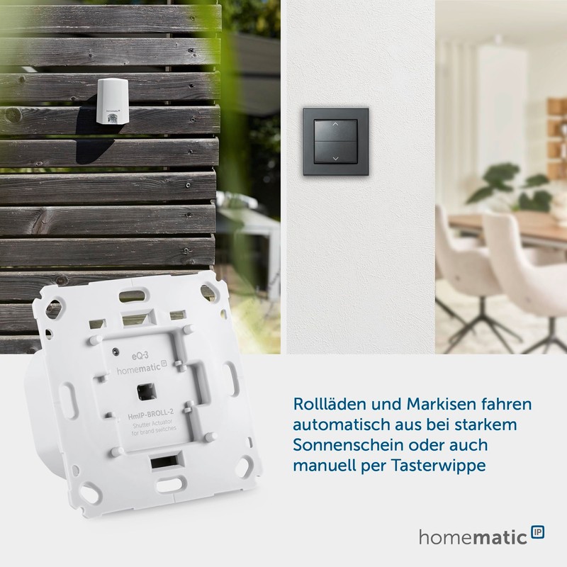 • Flush-mounted actuator for automated control of roller shutters and awnings via the Homematic IP app, via Homematic IP remote control or directly via the button rocker of the switch.