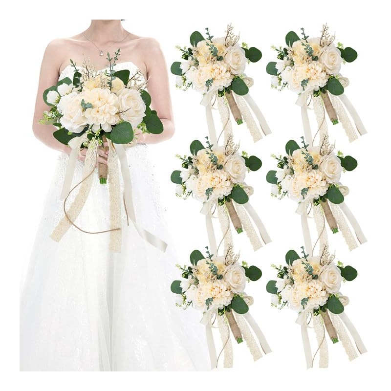 - Set of 6 artificial bridesmaid bouquets for wedding. Made of a mix of high quality silk and plastic type material