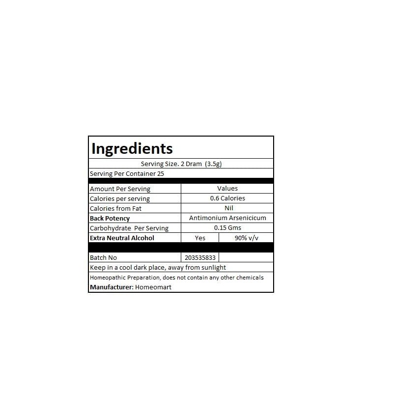 Ingredients: Antimonium Arsenicicum Homeopathic Dilution of desired potency, Sucrose. Packed in sterile 2-dram glass vials, each containing more than 220 pellets. Prepared by traditional hand succussion