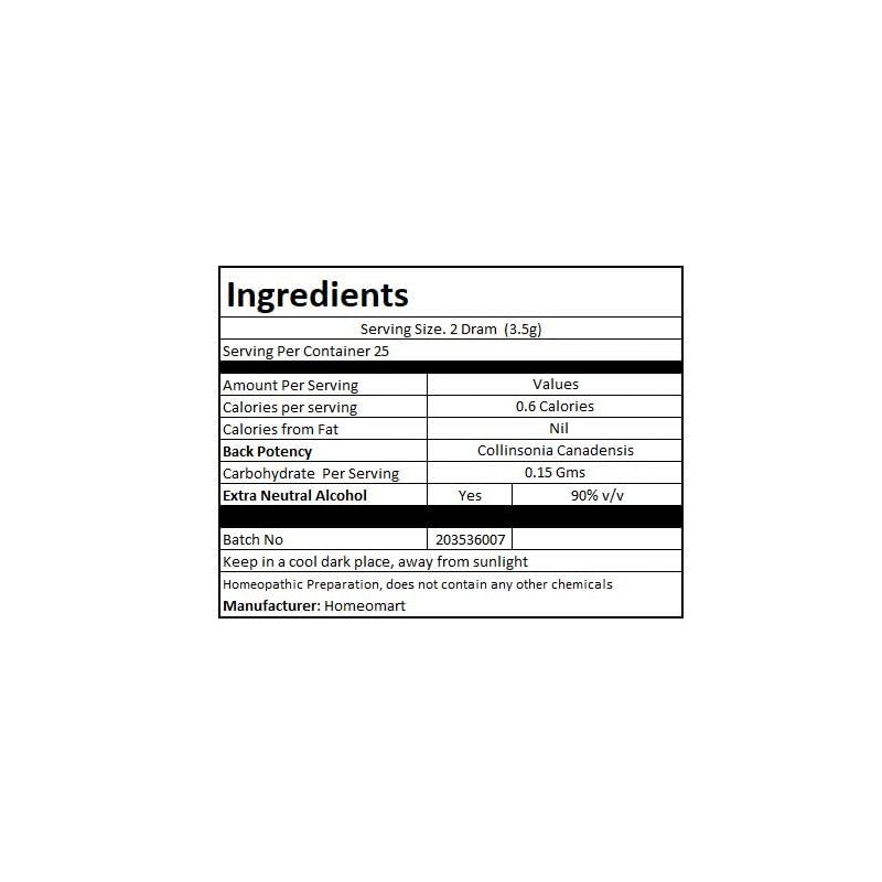 Ingredients: Collinsonia Canadensis Homeopathic Dilution of desired potency, Sucrose. Packed in sterile 2-dram glass vials, each containing more than 220 pellets. Prepared by traditional hand succussion