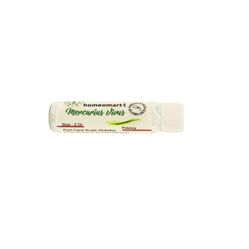 Ingredients: Mercurius Vivus Homeopathic Dilution of desired potency, Sucrose. Packed in sterile 2-dram glass vials, each containing more than 220 pellets. Prepared by traditional hand succussion