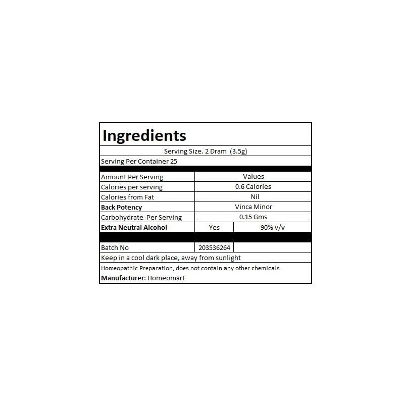 Ingredients: Vinca Minor Homeopathic Dilution of desired potency, Sucrose. Packed in sterile 2-dram glass vials, each containing more than 220 pellets. Prepared by traditional hand succussion