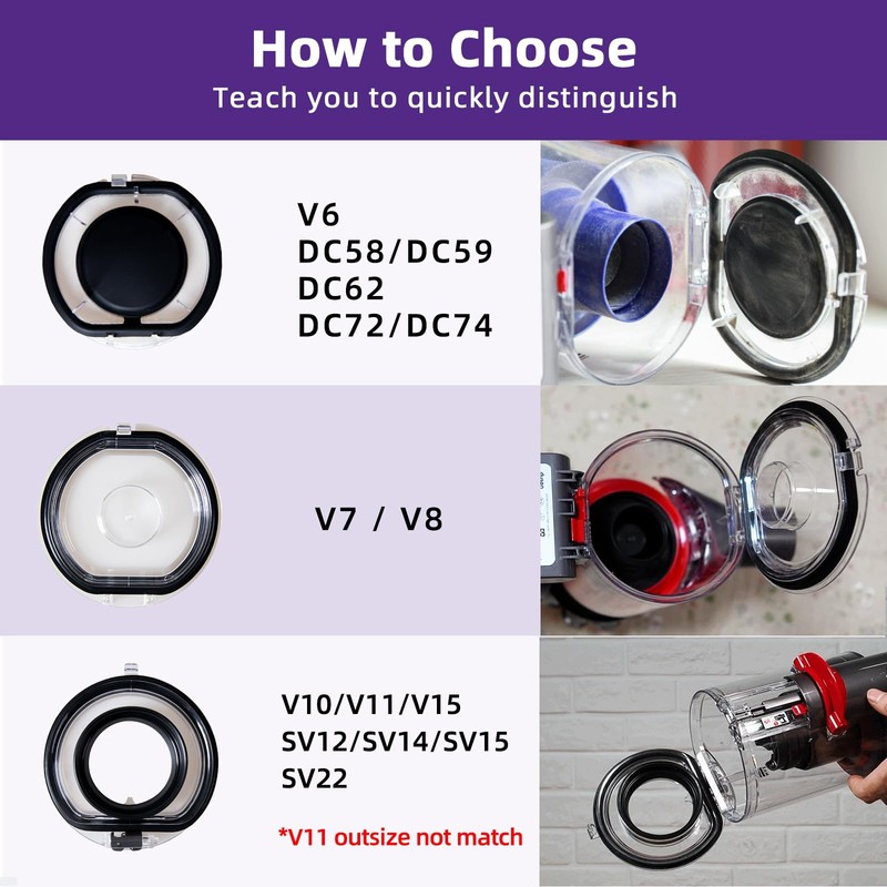 - Compatibility Model: The bin lid replacement suitable for Dyson V10 V11 V15 SV12 SV14 SV15 SV22 vacuum cleaner, please double-check your vacuum cleaner's model and dust bin size