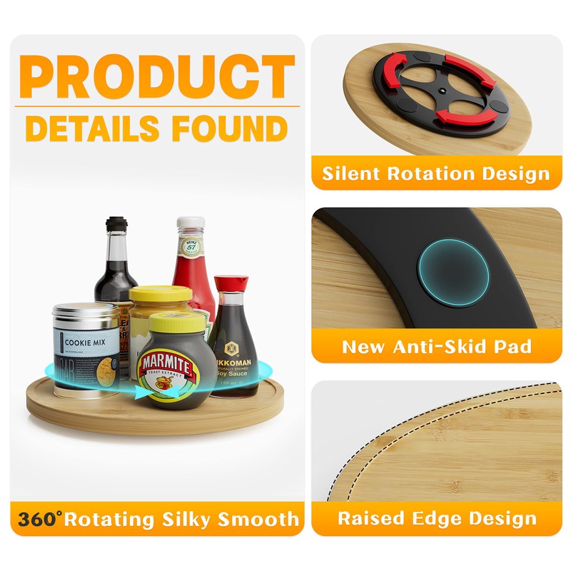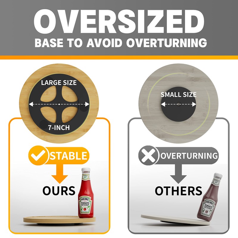 • ✔️【Updated design】The higher quality swivel base enjoys the ultimate comfort and convenience that a smooth and silent rotation entails. Compared to other products, our lower turning section (17.8 cm) is larger to effectively prevent items from tipping over. Will not be like other turntables because the uneven gravity makes it difficult to rotate.