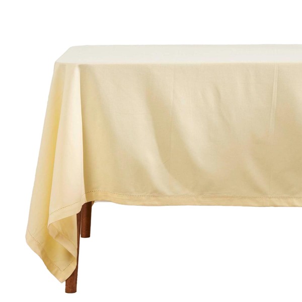 - HIGH QUALITY COTTON: 100% cotton table cloth woven from traditional hand looms. Plain rectangular table cover with a decorative hem stitch edge and a luxurious weighty drape. Set includes 1 cream tablecloth, 137 x 228cm.