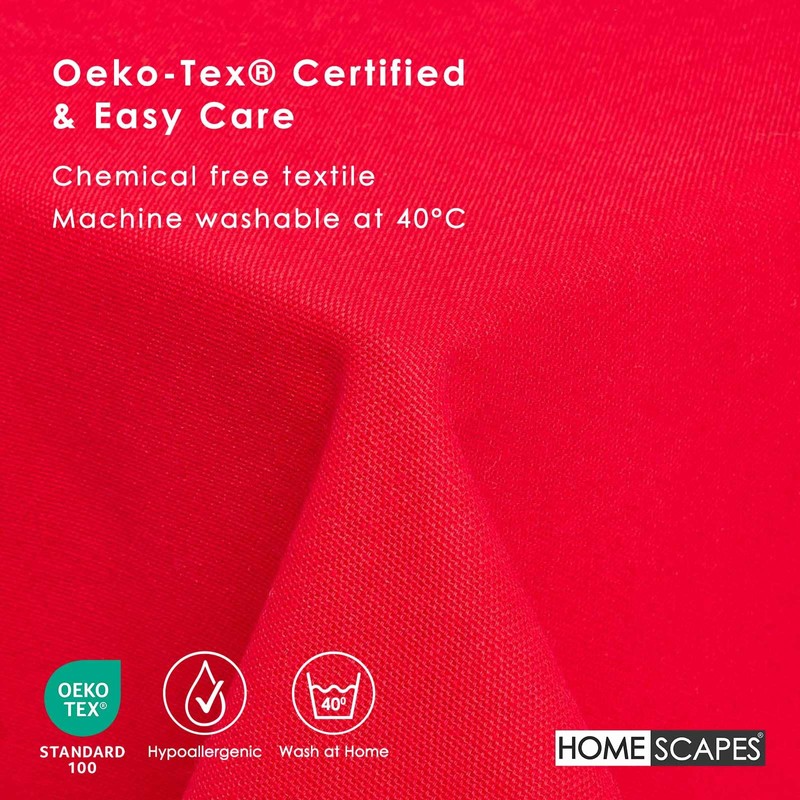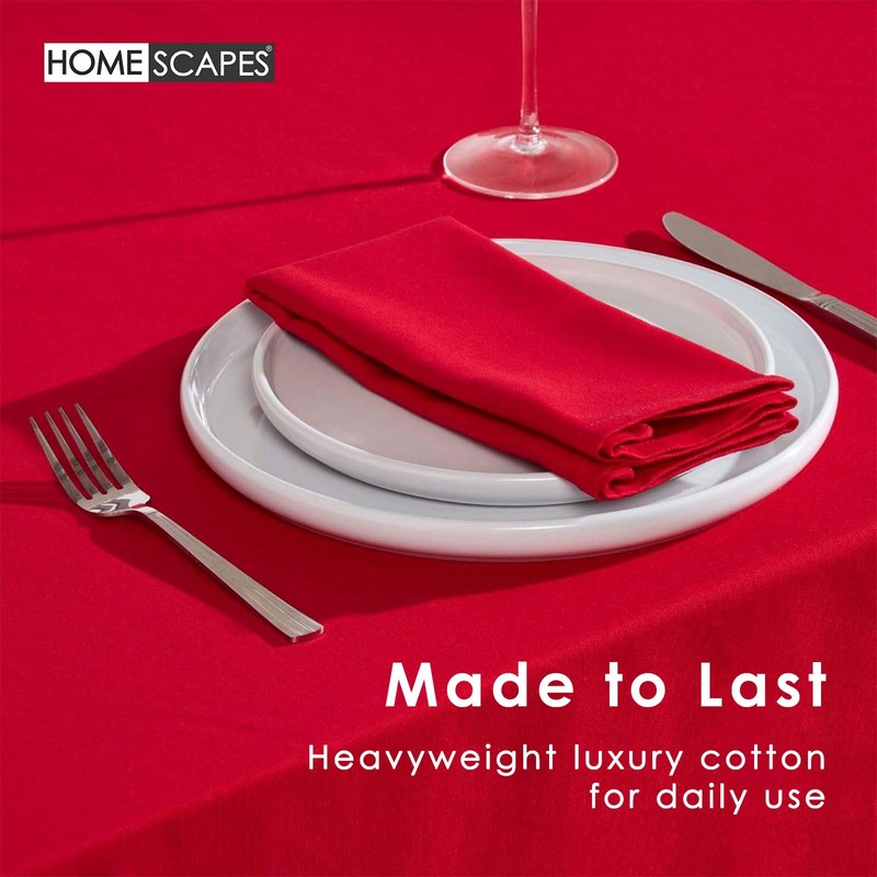 - MIX & MATCH: Comes in a variety of vibrant colours, shapes and sizes. A versatile red table cloth for kitchen, party tablecloth, outdoor picnic tablecloth and more. Matching placemats, napkins and table runners available to complete the look.With more than 24 years of expertise, Homescapes has offered uniquely affordable luxury and is a leading manufacturer of luxurious home decorations in the UK and Europe.
