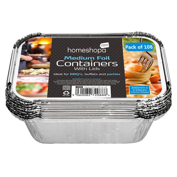 Homeshopa Aluminum Foil Trays Containers with Lids, 108 Pack Medium Disposable Meal Prep Food Storage Takeaway Tin, Reusable Catering Trays with Secure Lid for Roasting Baking Cooking & Freezing