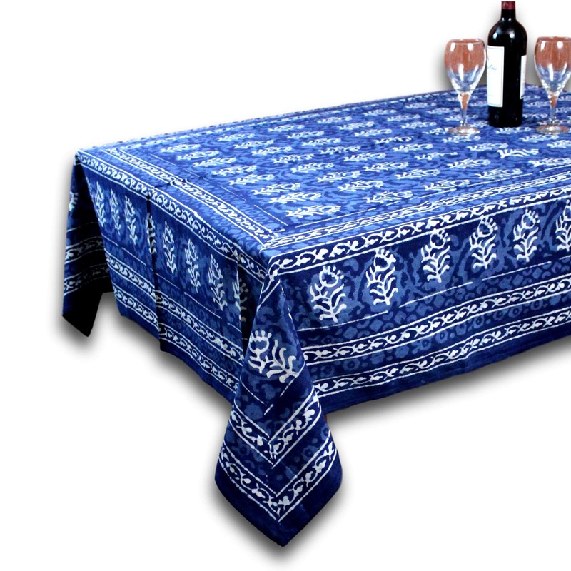 • DESIGN: A beautiful rectangular tablecloth highlighting a spectacular hand block print "Dabu" floral design in shades of indigo blue flaunting a fascinating border. This 100% cotton tablecloth is a perfect fit and a necessary essential to compliment the decor of your dining ensemble.
