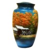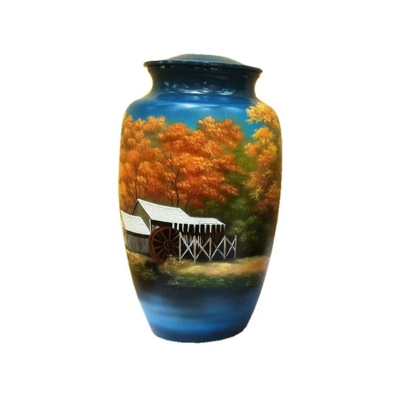 The Homestead brass urn is a beautiful scenic motif featuring a barn with gorgeous hues of blues and orange. This urn features a flat top lid. It is made of 100% aluminum and come with a threaded, airtight screw on lid to ensure contents remain securely in place. Hand painted by artisans of Viet Nam, several of these styles are exclusive.
