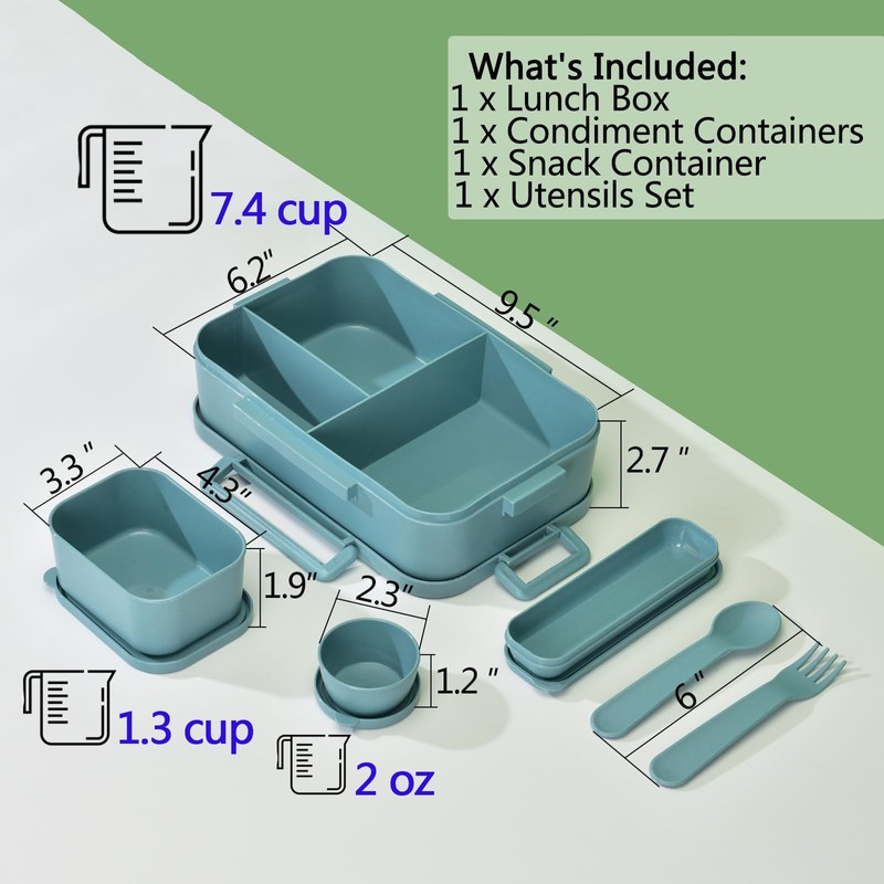 • ✅【Five-Compartment Bento Box】The size of Bento Box is 9.5*6.2*2.7 inches, perfect size with 5-compartment makes you can bring different kinds of food for your lunch just in one container. Additional 1.3 cups container 100% leakproof,you can bring soup or nut and plus a 1.3 oz Dipping container.