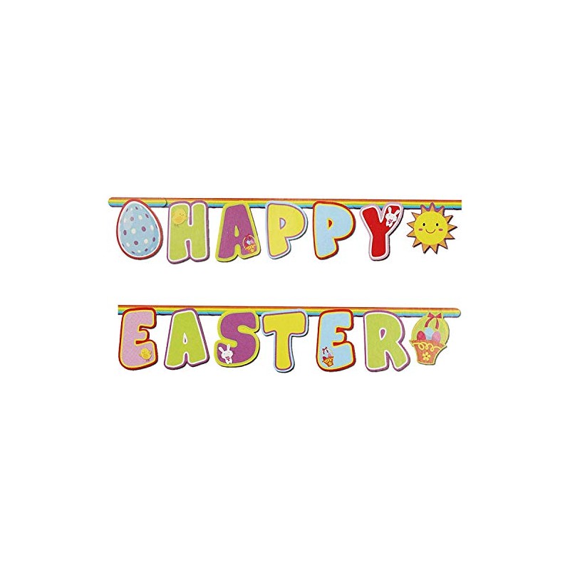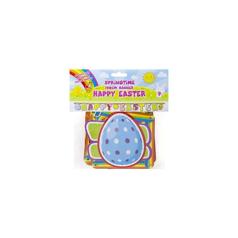- Great Quality Hanging Cardboard Banner says Happy Easter in bright and pastel springtime colours with Sunshine and eggs.