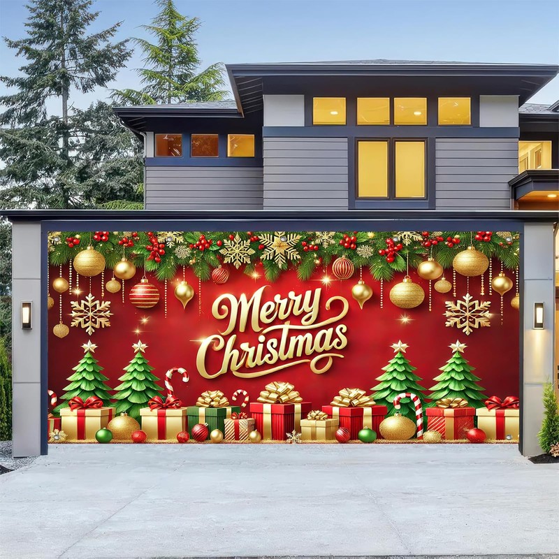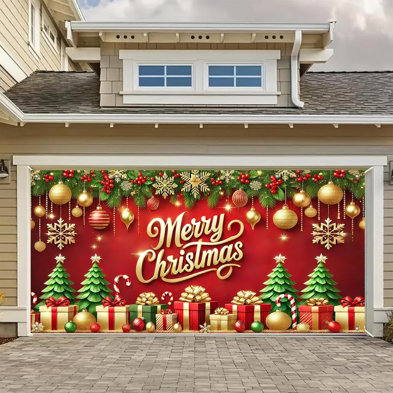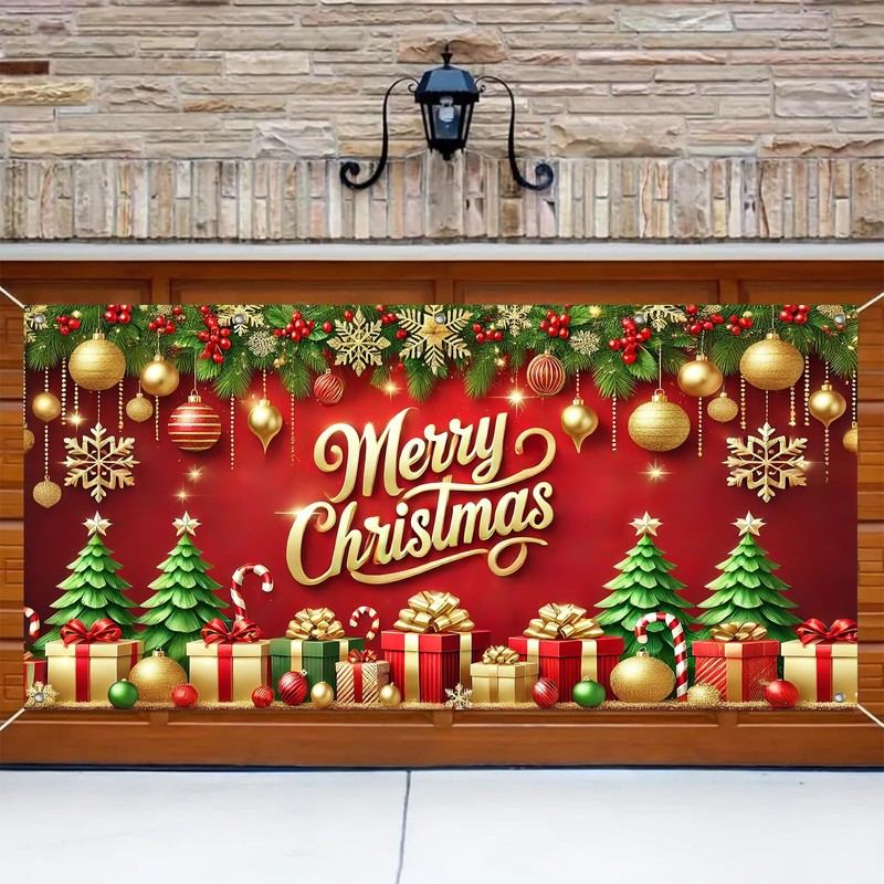 HOMETITUTE Christmas Garage Banner Backdrop 13x6ft Merry Christmas Gold Red Green Holiday Decoration Porch Entryway Wall Hanging Gift Boxes Candy Cane Pine Branch Lights Seasonal Display