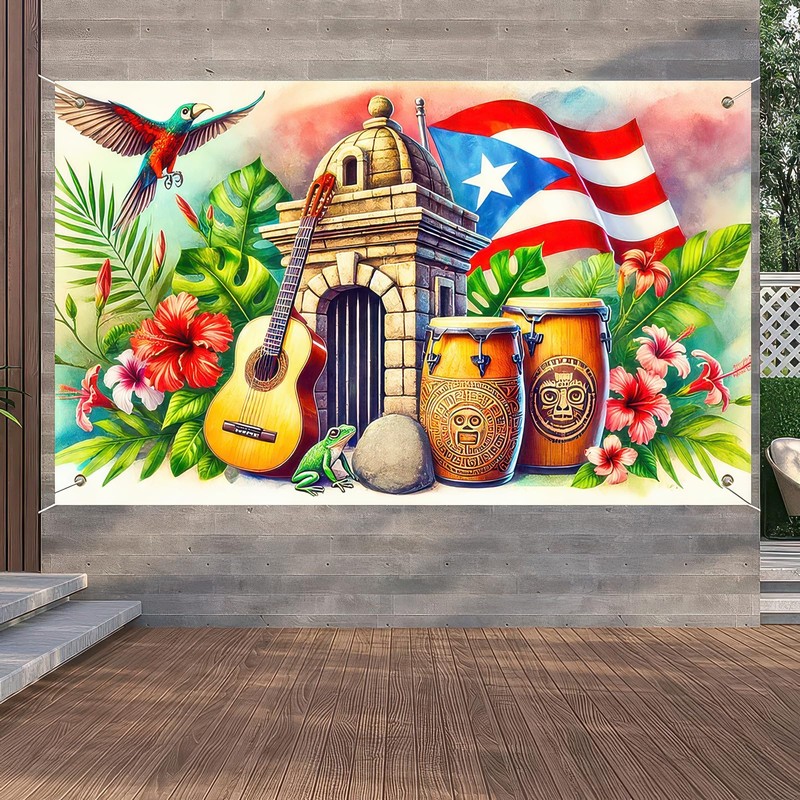 - 【Rich Puerto Rican Cultural Representation】This backdrop vividly showcases Puerto Rican culture with iconic elements. The fluttering Puerto Rican flag, traditional musical instruments like the guitar and drums, and the historic stone structure create an immersive cultural scene. Tropical flora and a colorful parrot add to the vibrant atmosphere, perfect for capturing the essence of Puerto Rico in your photos.